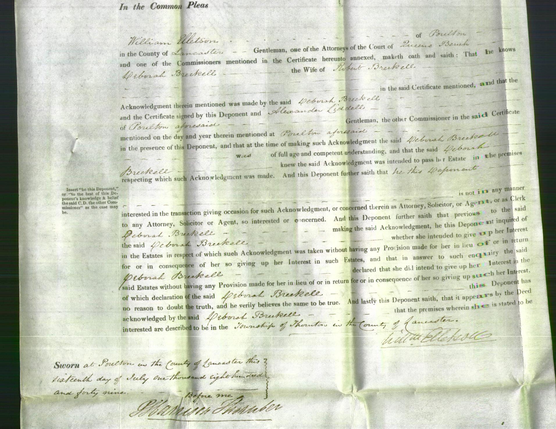 Court of common pleas document - Deborah Breckell wife of Robert Breckell