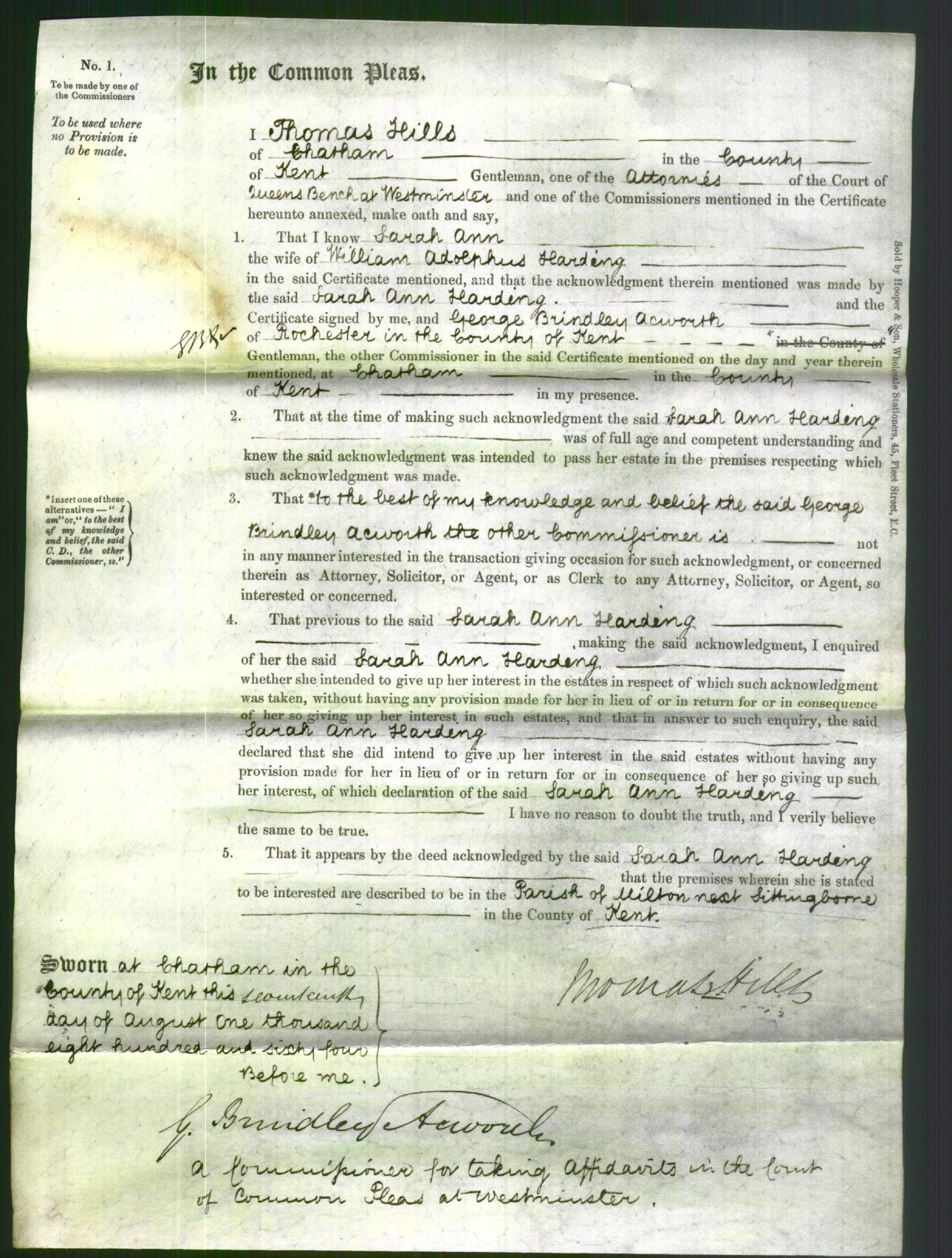 Court of common pleas document - Sarah Ann Harding wife of William Adolphus Harding