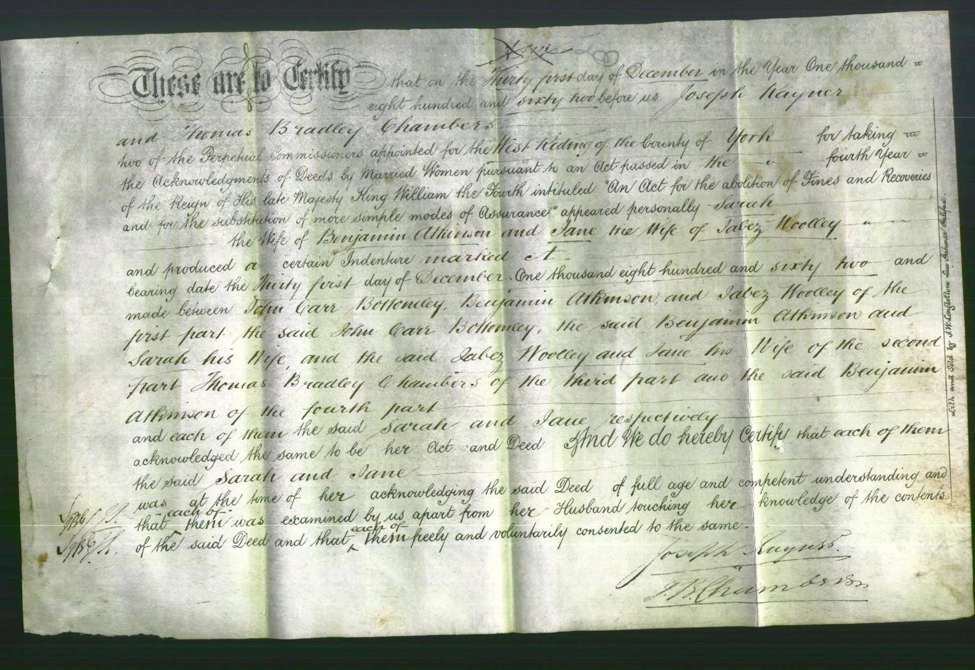 Certificate of acknowledgement of deed by married women - Sarah Atkinson wife of Benjamin Atkinson and Jane Woolley wife of Jabez Woolley